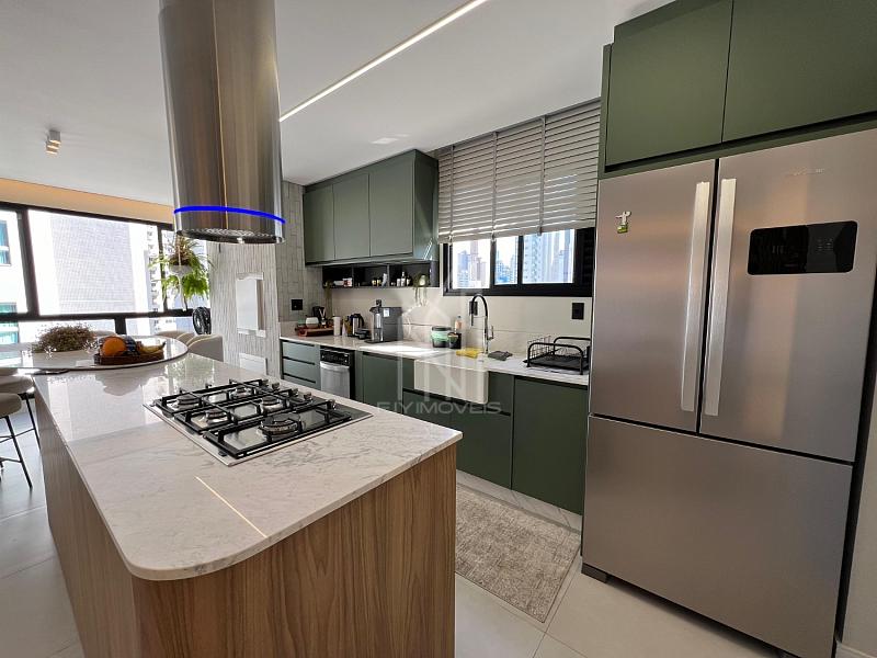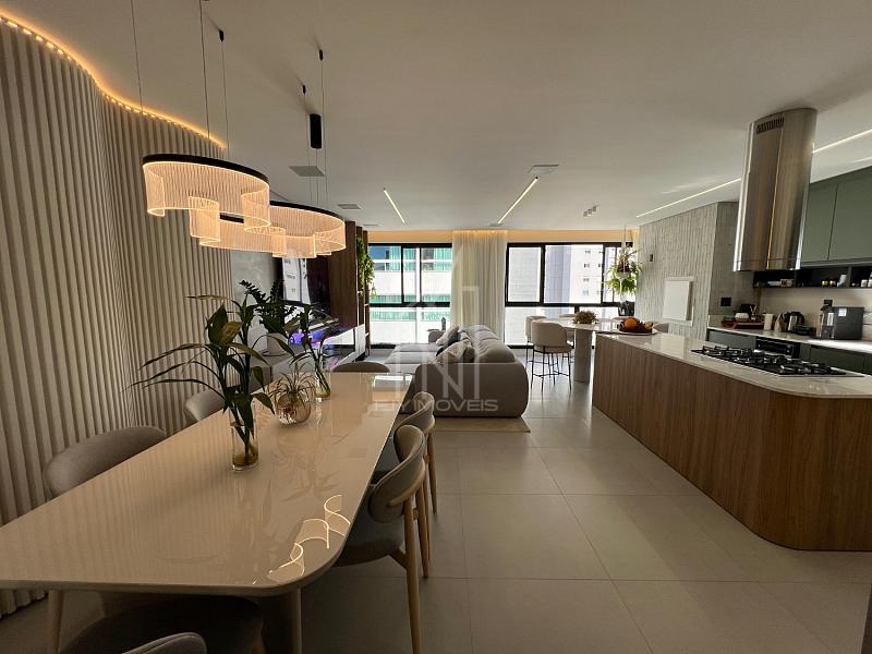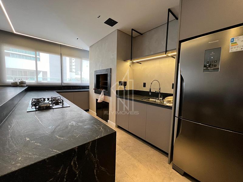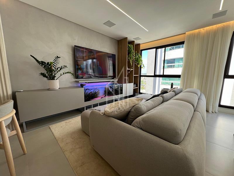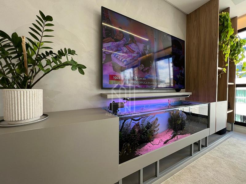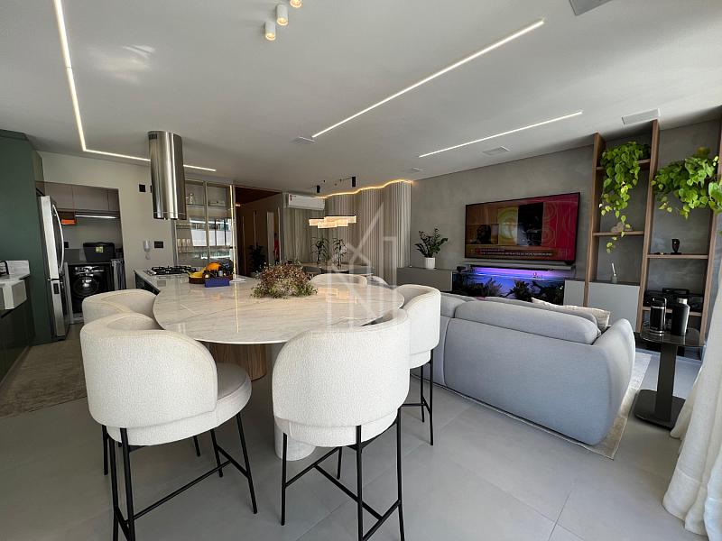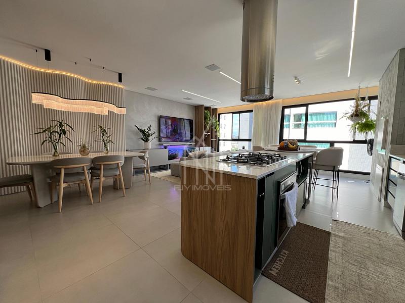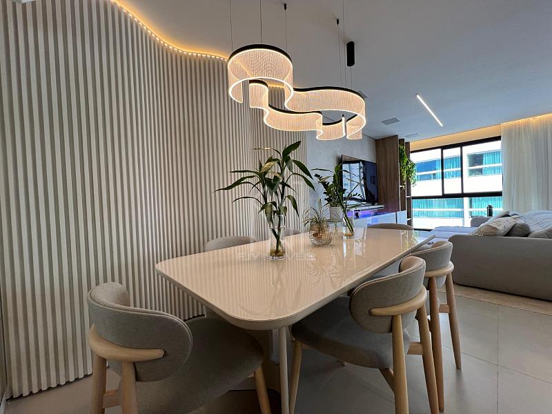 Apartamento possuí 03 suítes, 126m² privativos, 02 amplas vagas de garagem, livig integrado com churrasqueira a carvão, finamento mobiliado e decorado.