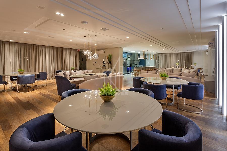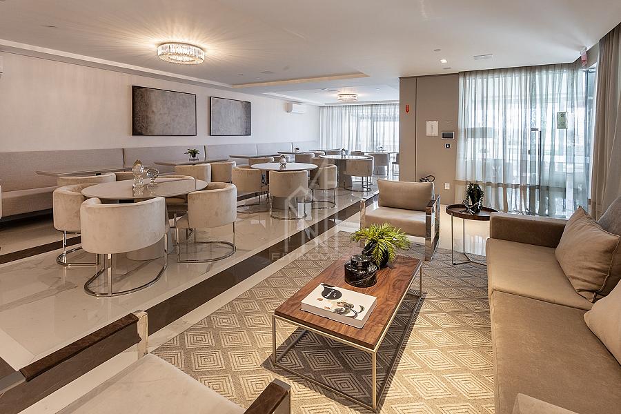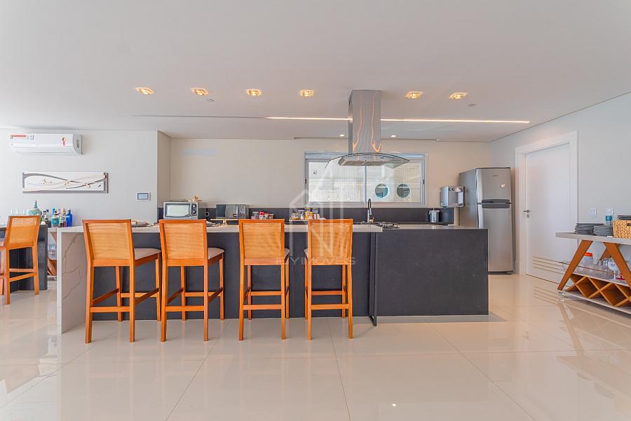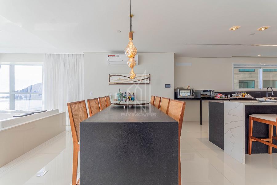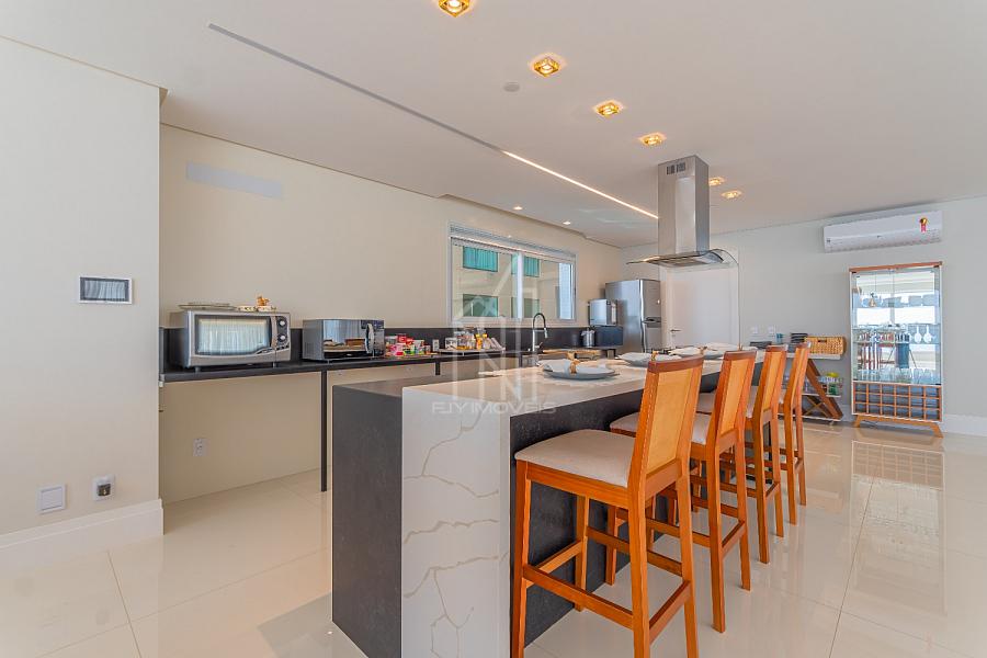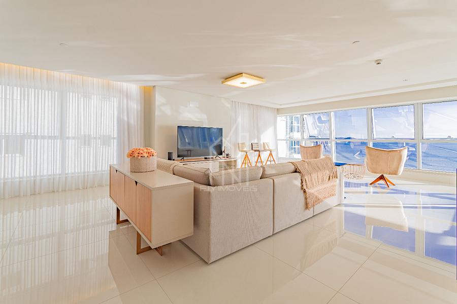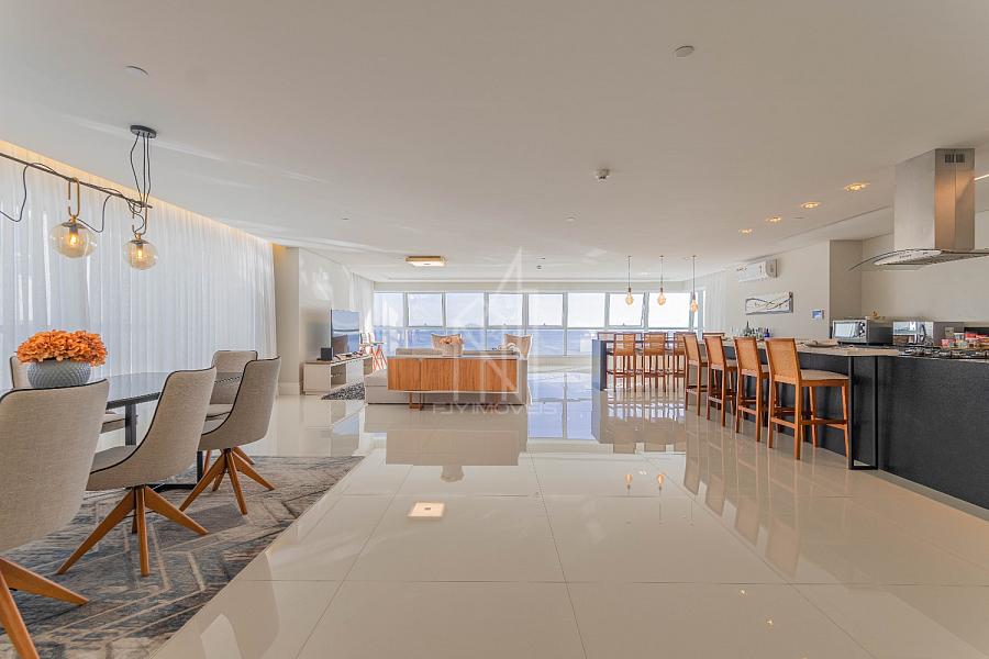 5 Suítes (suítes Master com sala de banho e closet), living para 3 ambientes com vista 112° e cozinha gourmet integrados com 115m², churrasqueira, lavabo, área de serviço com dormitórios, banheiro de serviço  mobiliado e decorado e 5 vagas de garagem (Cabem 6 carros)