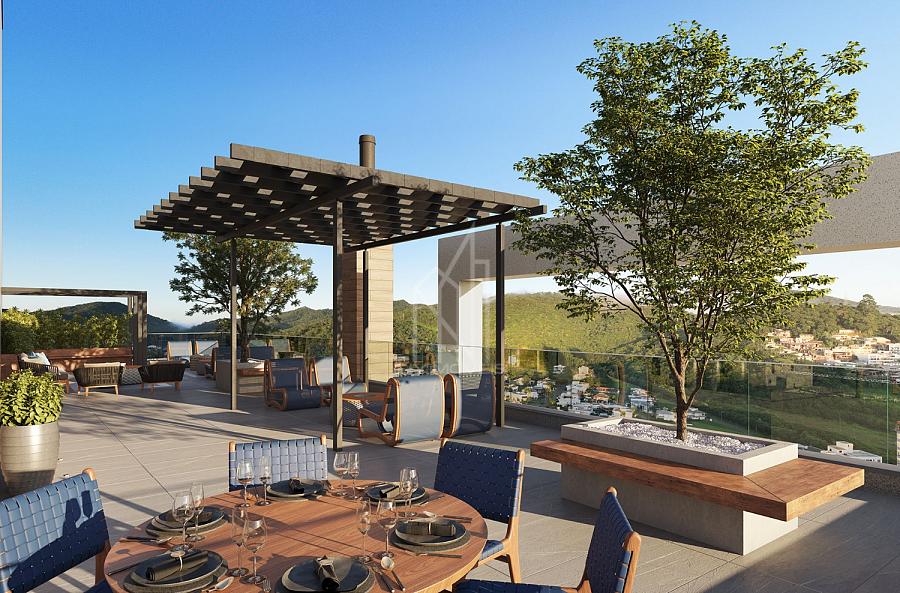 O lazer está concentrado no rooftop, distribuído em dois pavimentos exclusivos. Nessa área panorâmica, equipada e mobiliada, você encontra piscina aquecida com vista para o mar e para a mata atlântica, solarium, salão de festas, espaço gourmet e lounge open air, sala de jogos, brinquedoteca, espaço fitness e Wi‑Fi nas áreas comuns