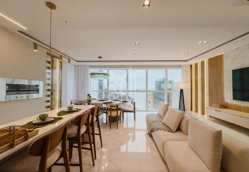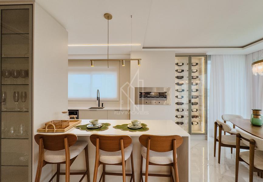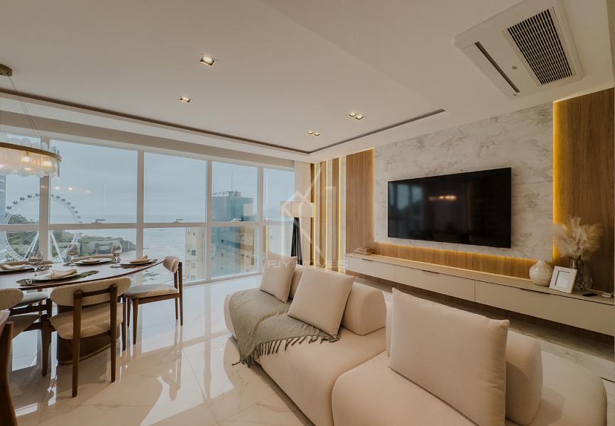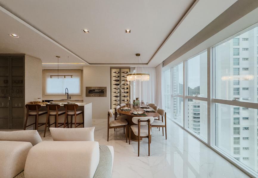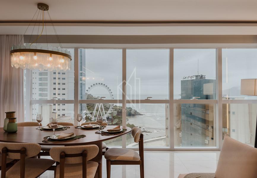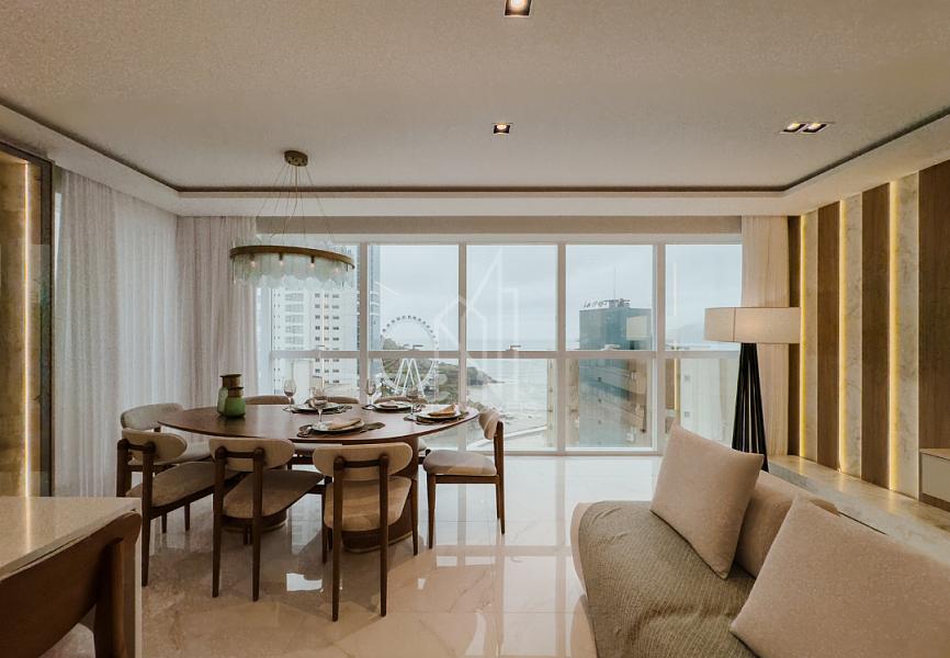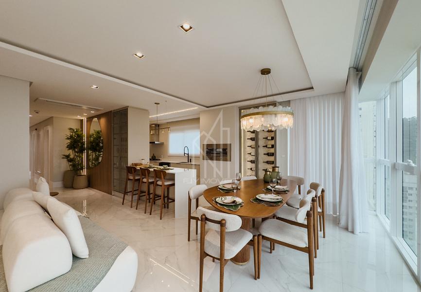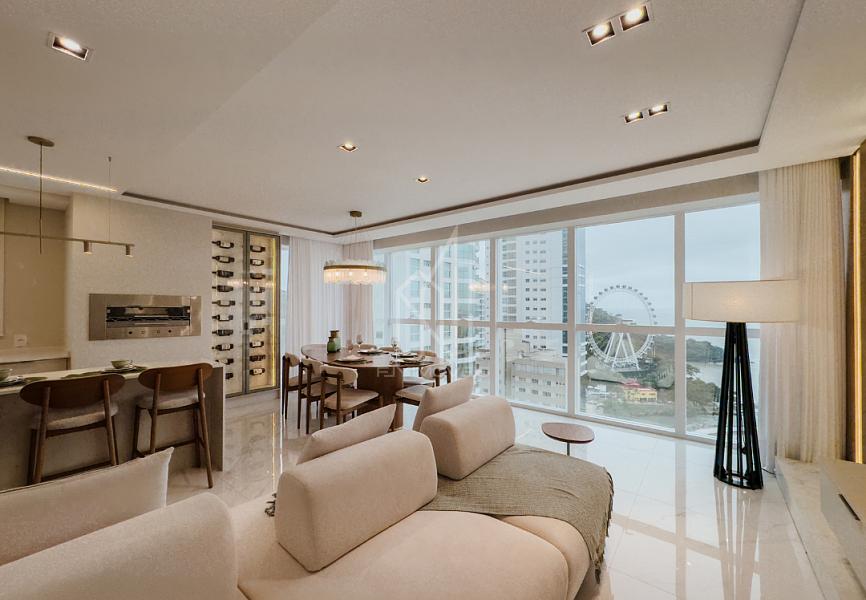 [DECORADO] Apartamento no edifício Skyline tower da construtora FG em Balneário Camboriú, apartamento amplo com 150,06m² de área privativa sendo 04 suítes, banheiro social, living amplo com dois ambientes, sala de estar e sala de jantar, cozinha gourmet integrada, fachada em pele de vidro com vista para o mar e 03 vagas de garagem.