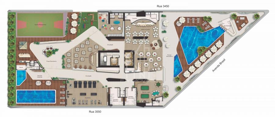Consta com área de lazer completa e todas as áreas comuns decoradas, piscina adulto, piscina infantil, salão de festas, espaço gourmet, quadra poliesportiva, praça de fogo, cinema, academia, lan house, playground, brinquedoteca, sala de jogos, bar molhado, sauna úmida, sauna seca, espalho d'água e terraço. Localizado em esquina da Avenida Brasil, Centro/sul de Balneário Camboriú.