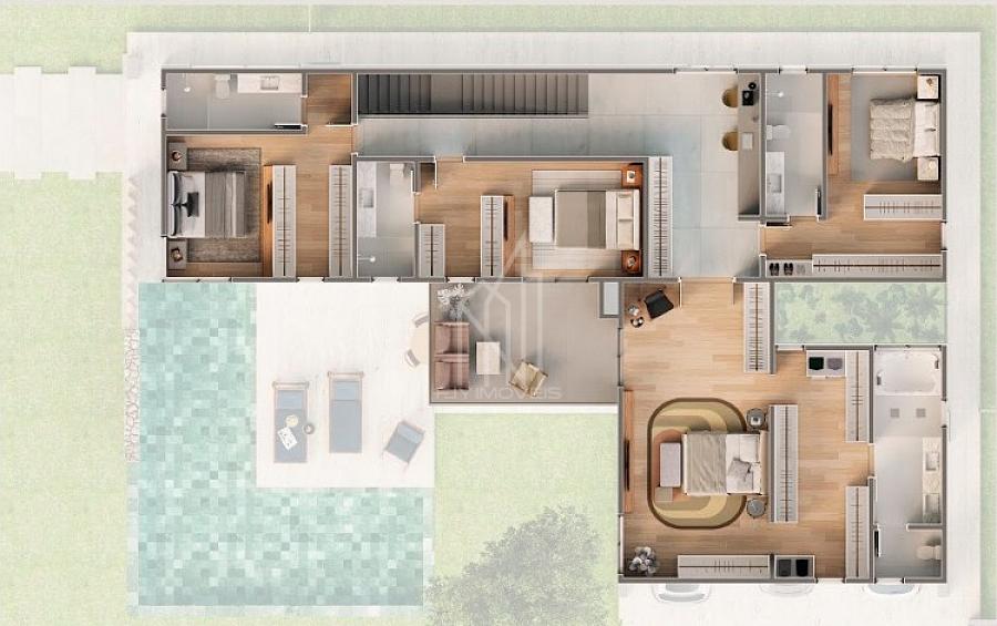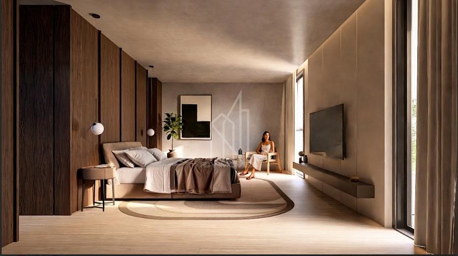 Com 537,95 m² de área construída, a residência conta com cinco suítes amplas, sendo uma no térreo, ideal para acessibilidade ou hóspedes. A suíte master impressiona com 57 m², oferecendo espaço, conforto e privacidade. No pavimento superior, há um home office espaçoso, além de uma ampla sacada que valoriza a iluminação natural e a ventilação cruzada.