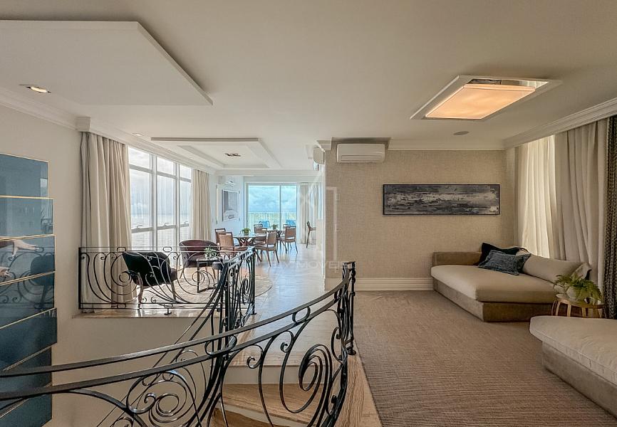 No piso superior, o ambiente social se destaca com uma espaçosa área gourmet, equipada com churrasqueira, ideal para momentos de lazer com familiares e amigos. A área também conta com hidromassagem, um living aconchegante e uma piscina privativa, perfeitos para relaxar e apreciar o visual inigualável do mar.