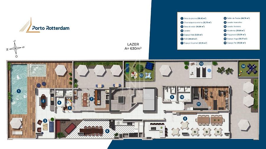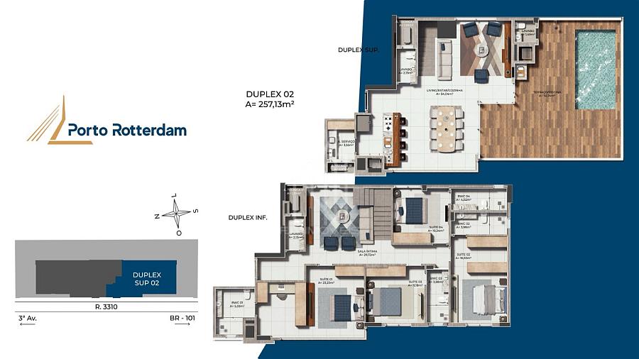 [COBERTURA DUPLEX] Apartamento no Edifício Porto Rotterdam Residece, 264,15 m² de área privativa, 04 suítes, banheiro social, living, churrasqueira a carvão, piscina privativa, vista panorâmica, 04 vagas de garagem privativas.